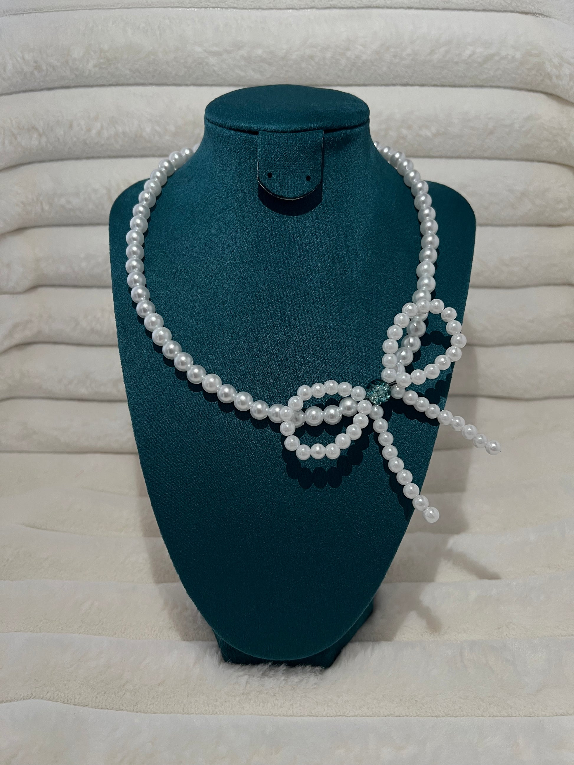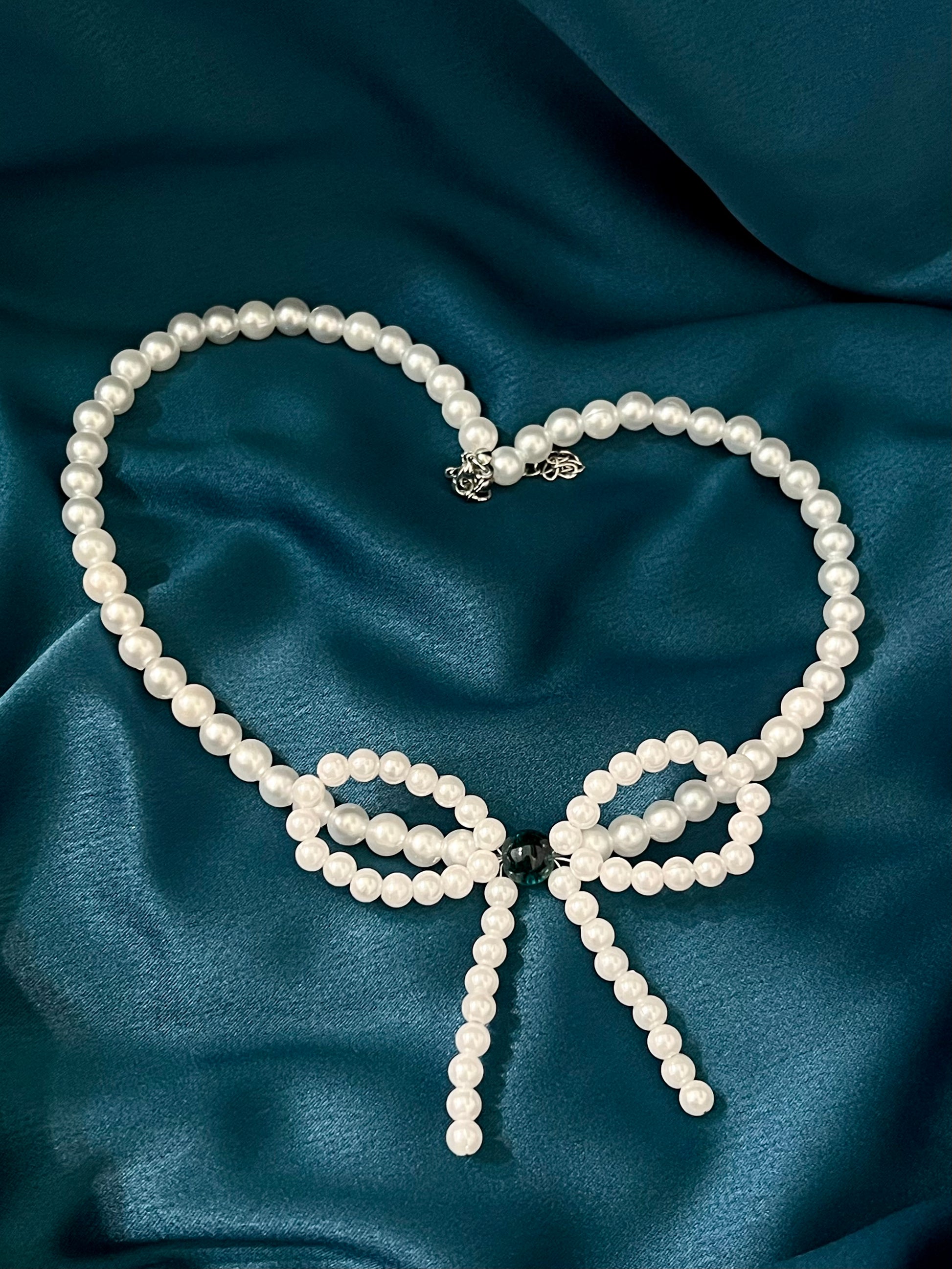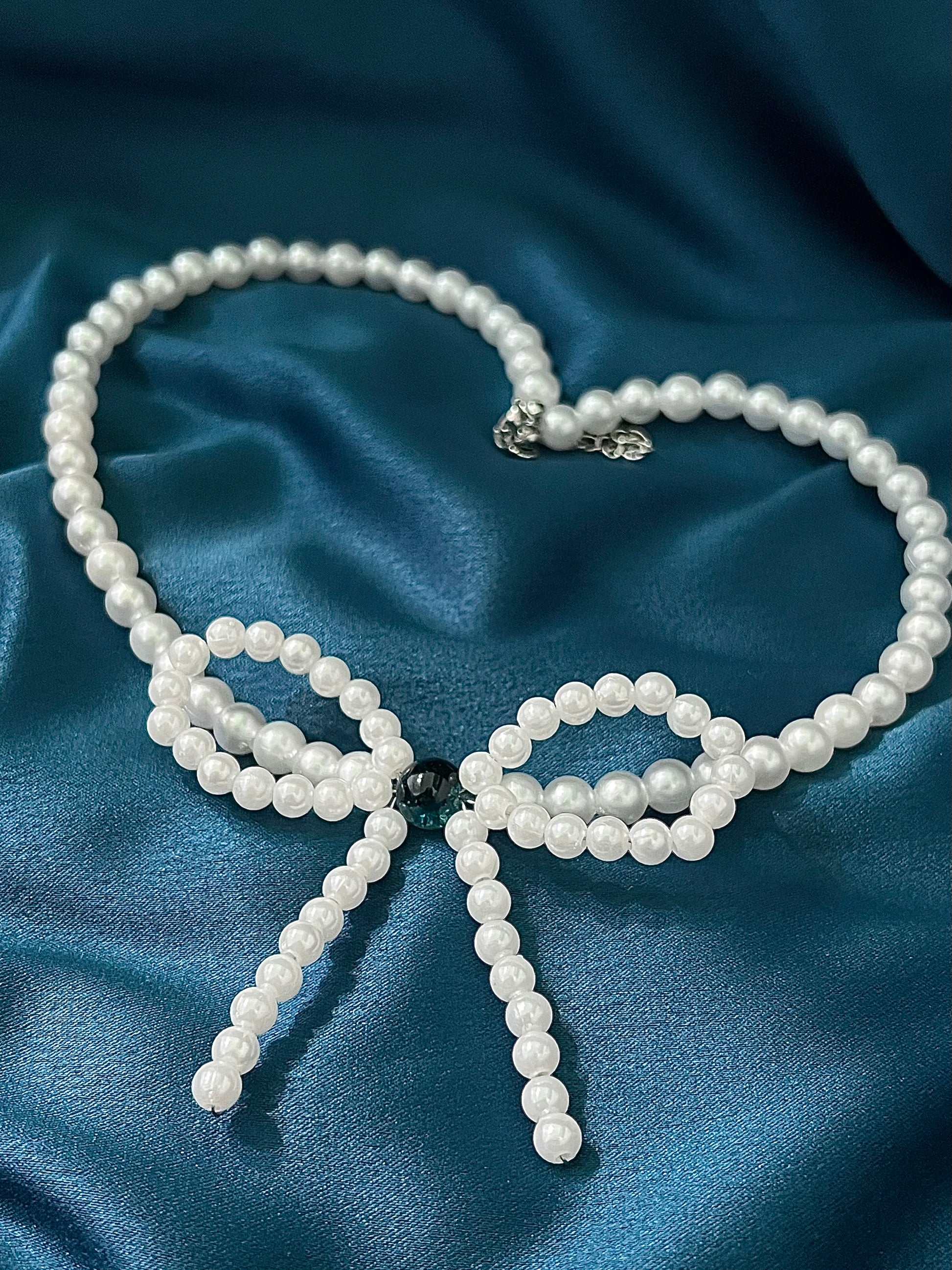 Colierul Eva este o piesă statement care îmbină delicatețea perlelor cu un design jucăuș și feminin. Nodul decorativ tip fundă, realizat tot din perle, atrage instant atenția și adaugă un aer romantic oricărei ținute. În centrul fundei, o perlă turcoaz adaugă contrast și un strop subtil de culoare.