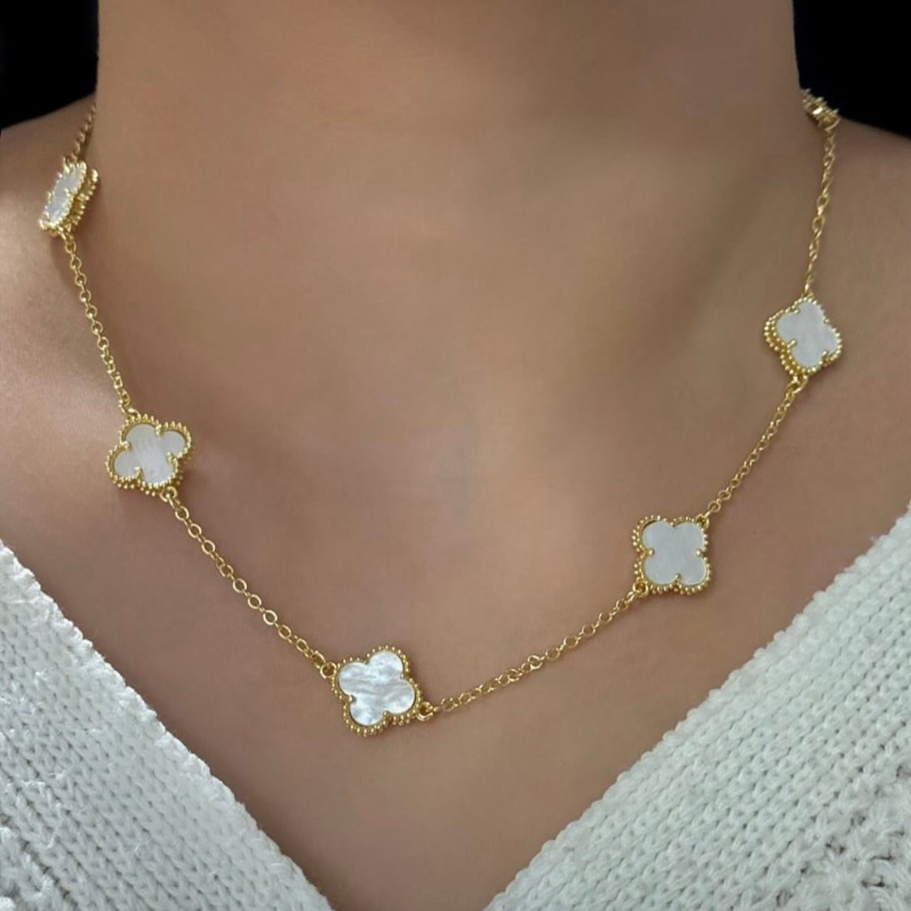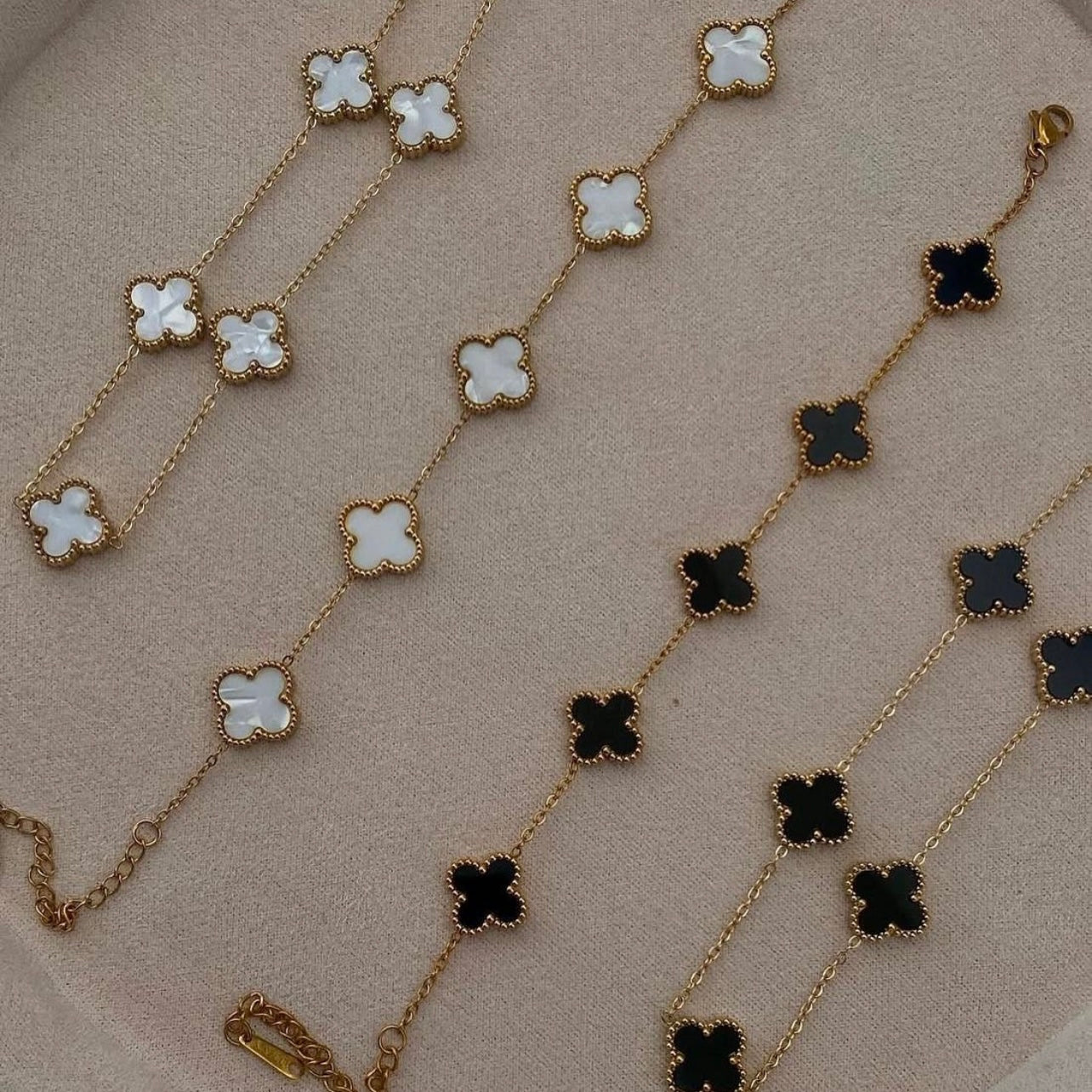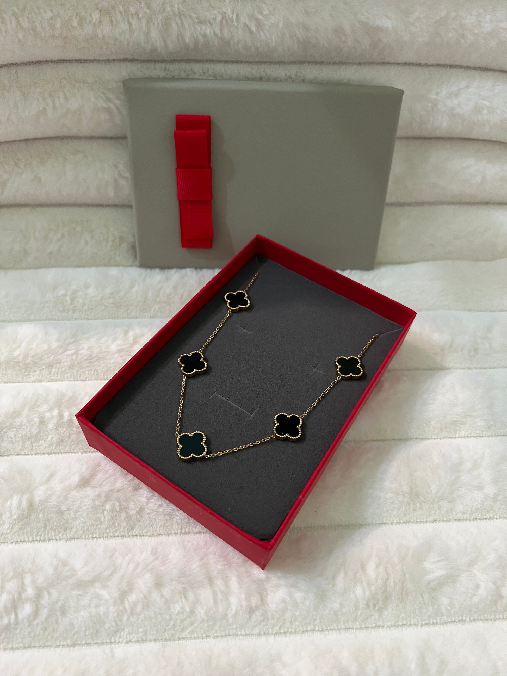 Colierul Sky este expresia eleganței discrete și a feminității moderne. Decorat cu motive florale stilizate în formă de trifoi cu patru foi – simbol al norocului și al armoniei – acest colier vine în două variante deosebit de rafinate: cu elemente email negru lucios sau alb perlat, montate pe lanț fin auriu.