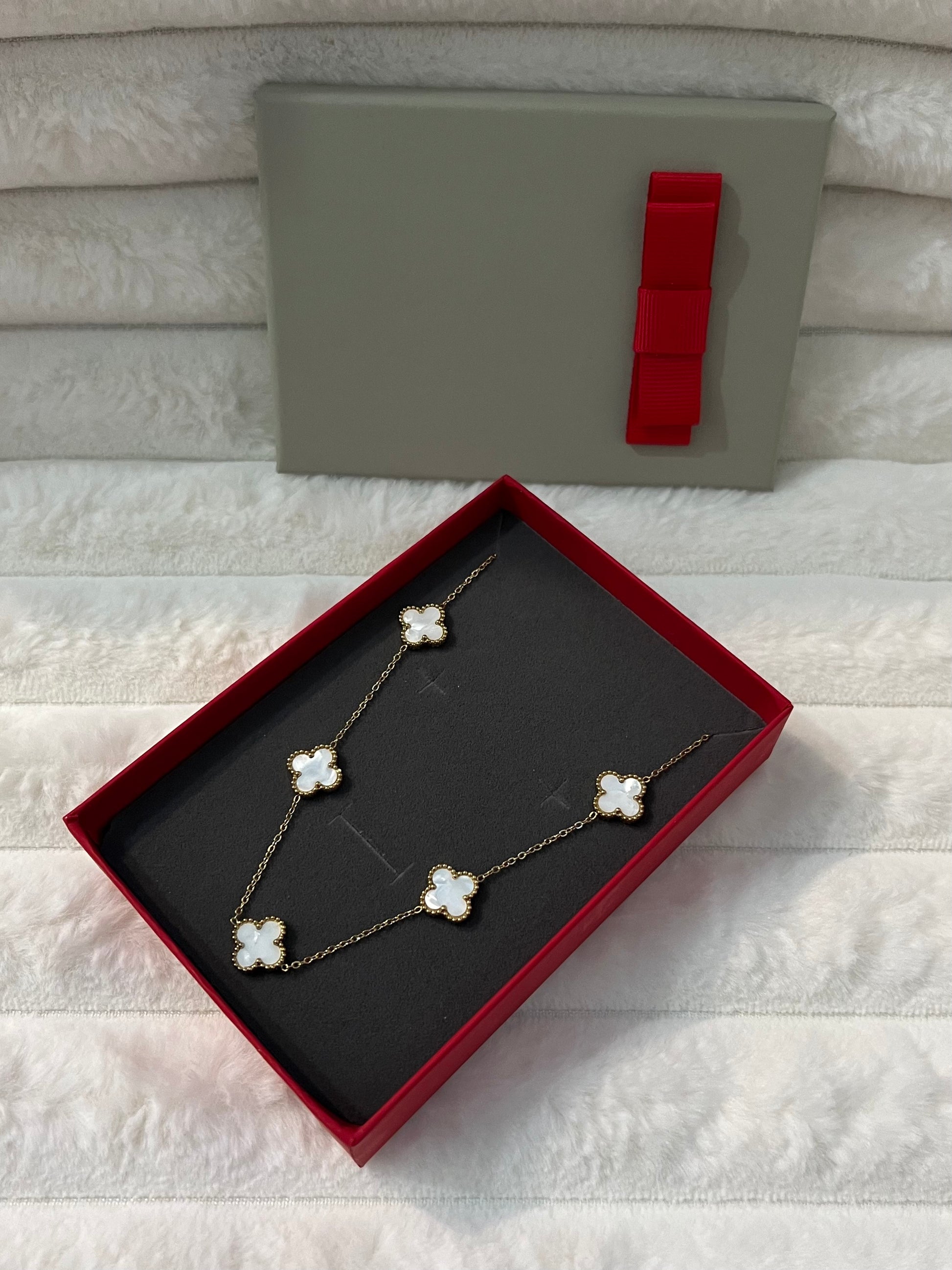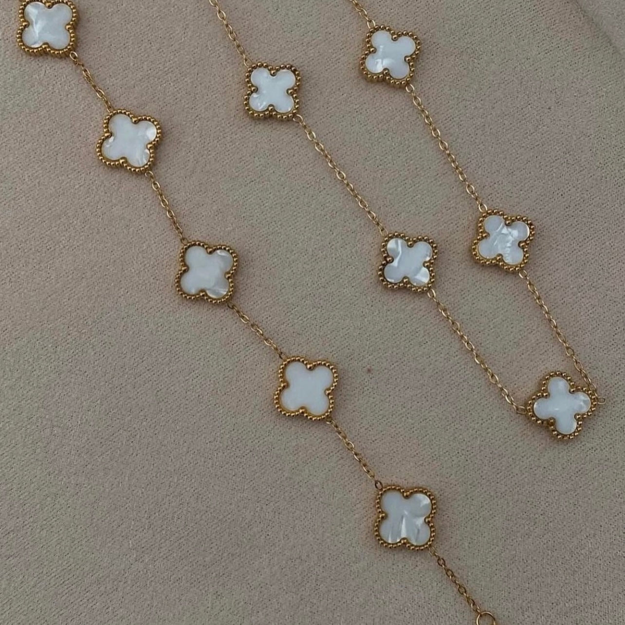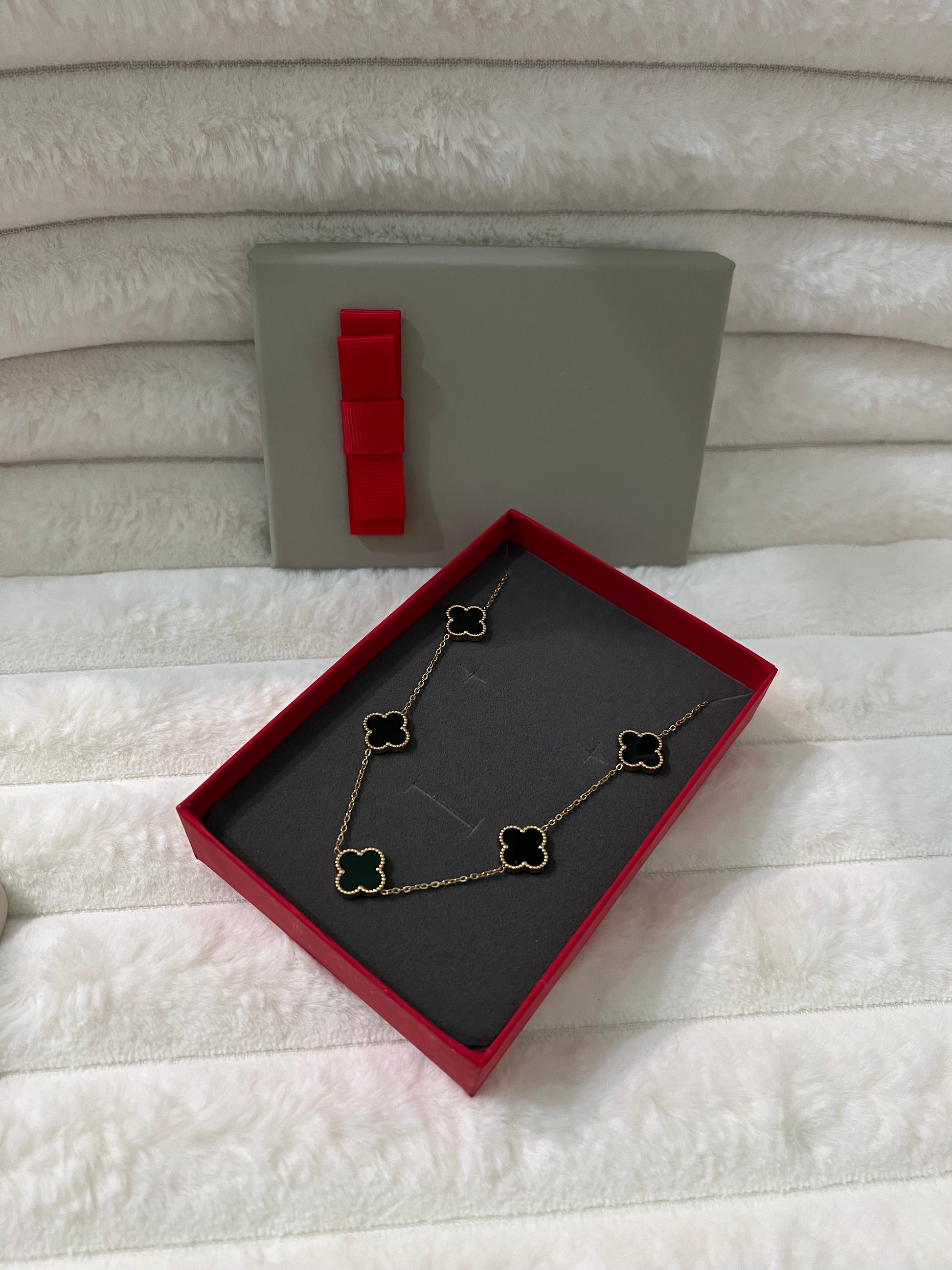 Colierul Sky este expresia eleganței discrete și a feminității moderne. Decorat cu motive florale stilizate în formă de trifoi cu patru foi – simbol al norocului și al armoniei – acest colier vine în două variante deosebit de rafinate: cu elemente email negru lucios sau alb perlat, montate pe lanț fin auriu.
