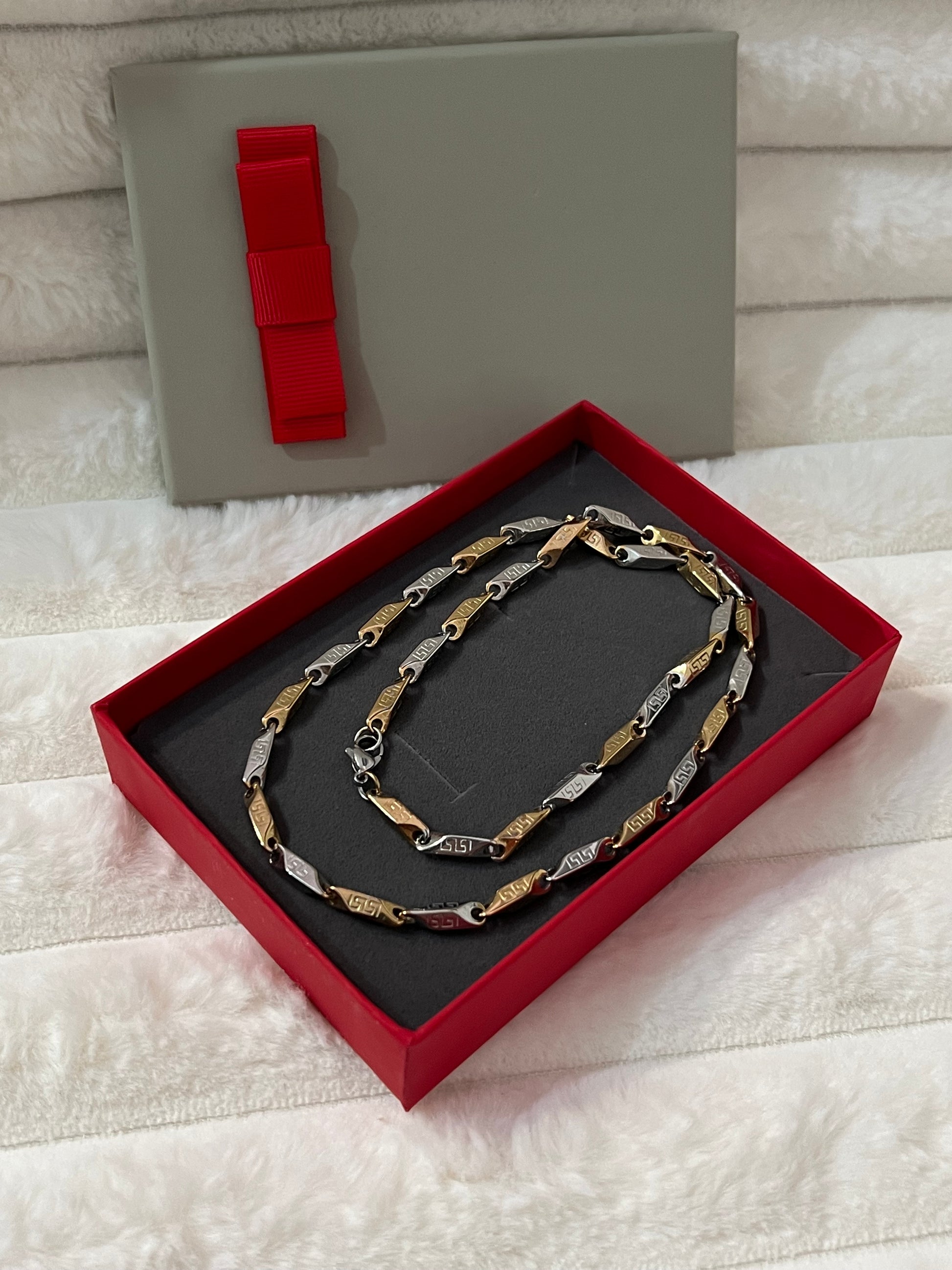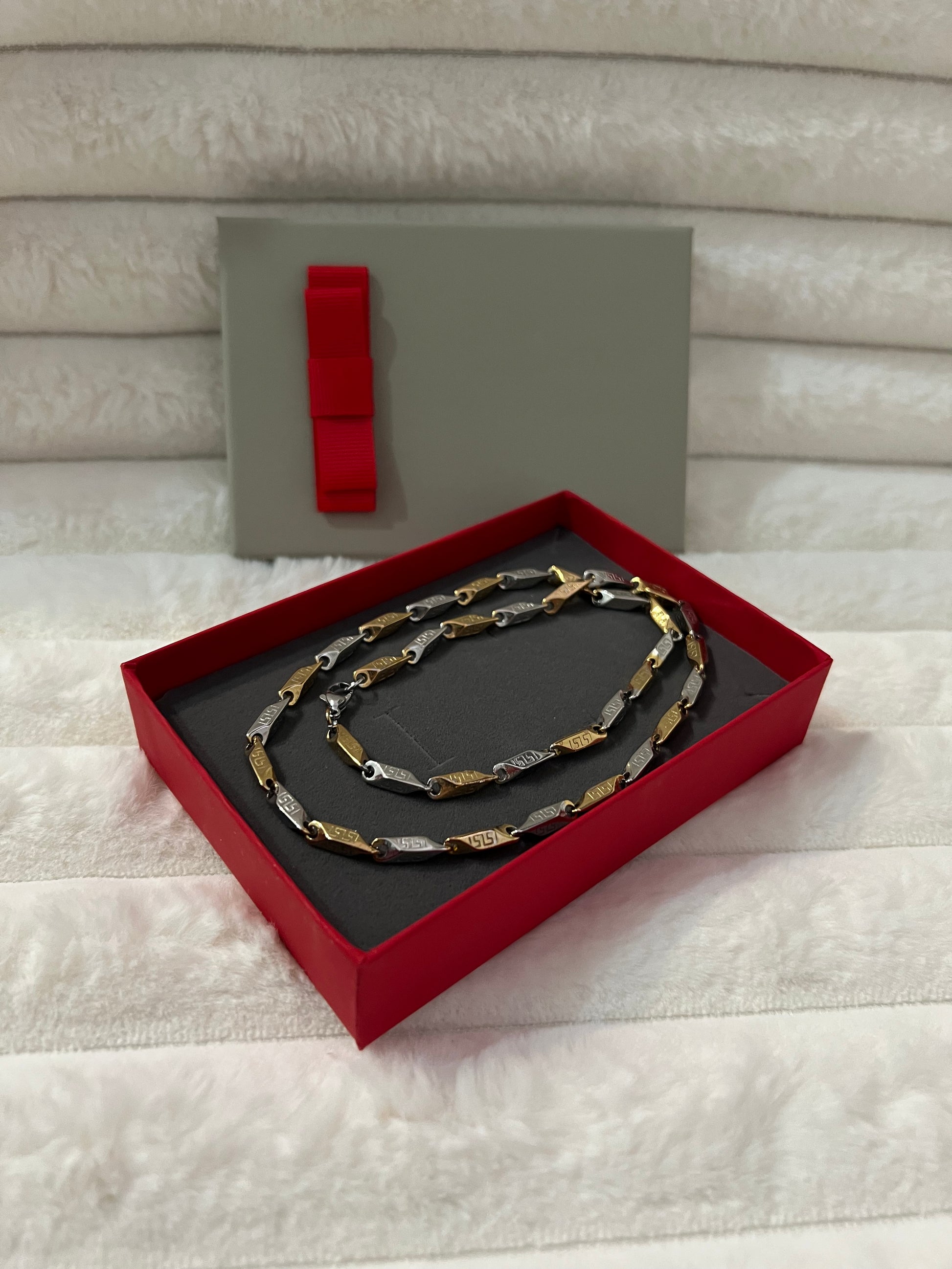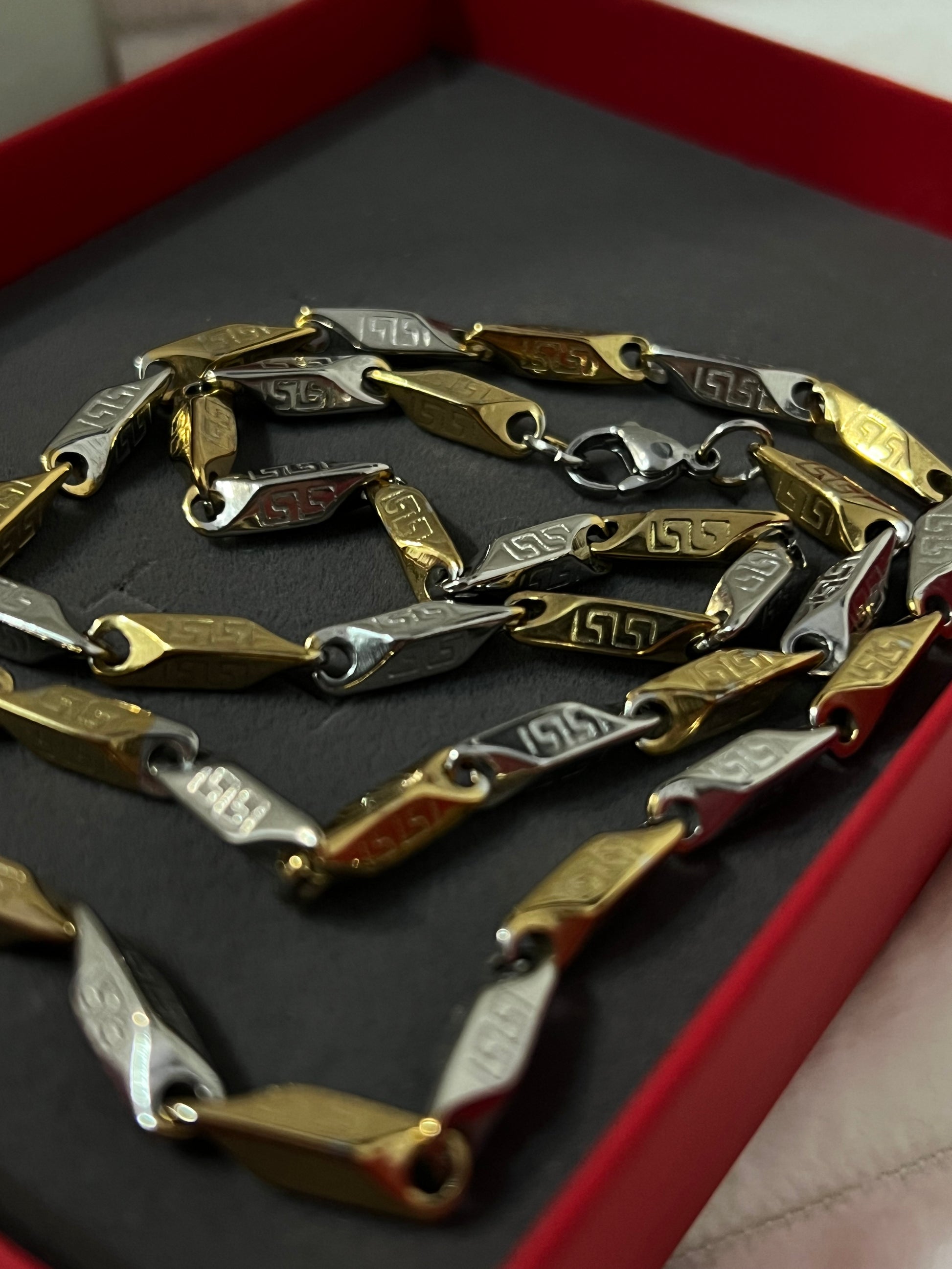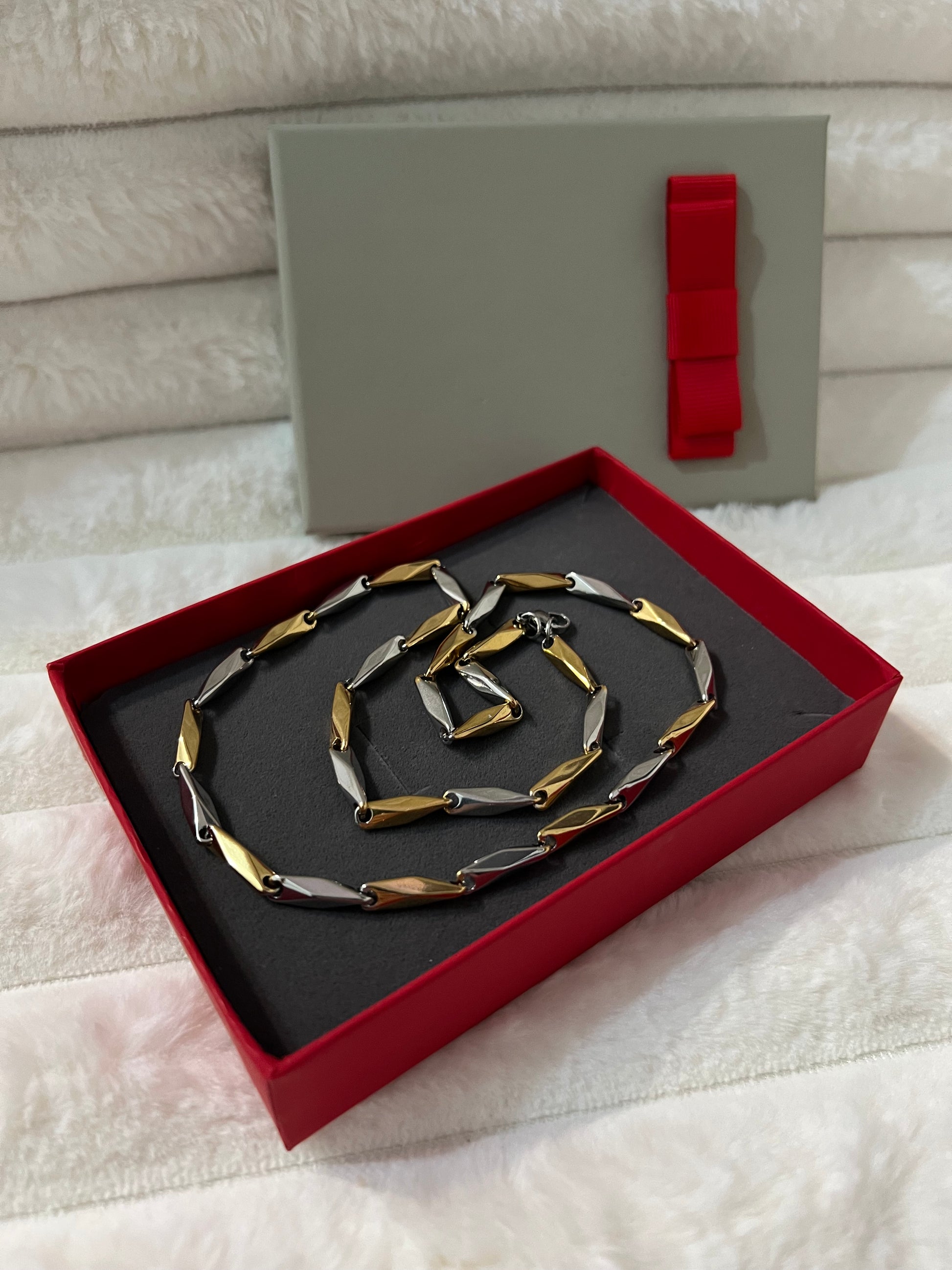 Lanțul Carl este o bijuterie creată special pentru bărbații care își doresc un accesoriu puternic, dar cu design rafinat. Realizat din oțel inoxidabil bicolor (auriu și argintiu), acest lanț îmbină forme geometrice ascuțite cu un finisaj lucios, oferind un aspect modern, masculin și versatil.