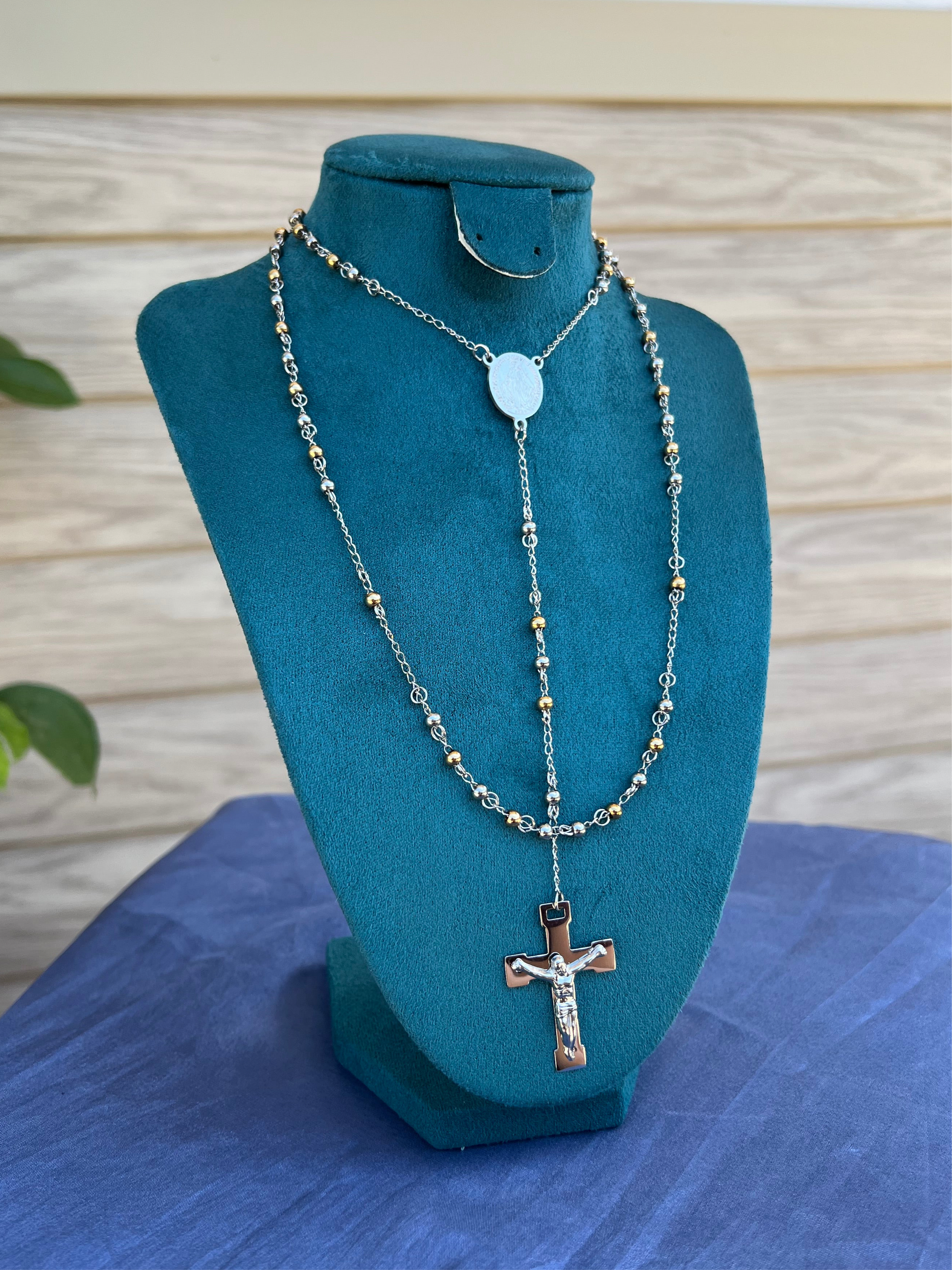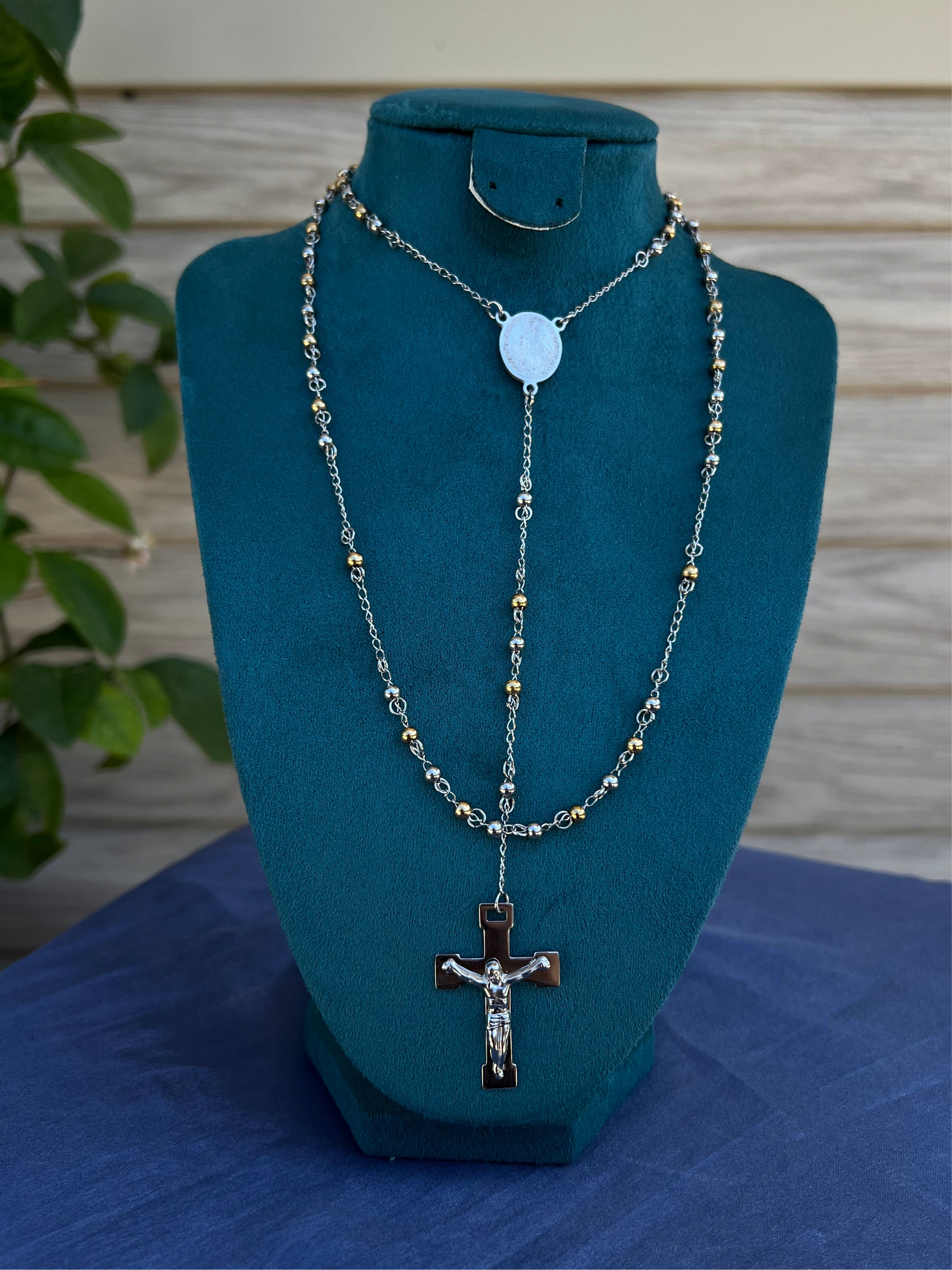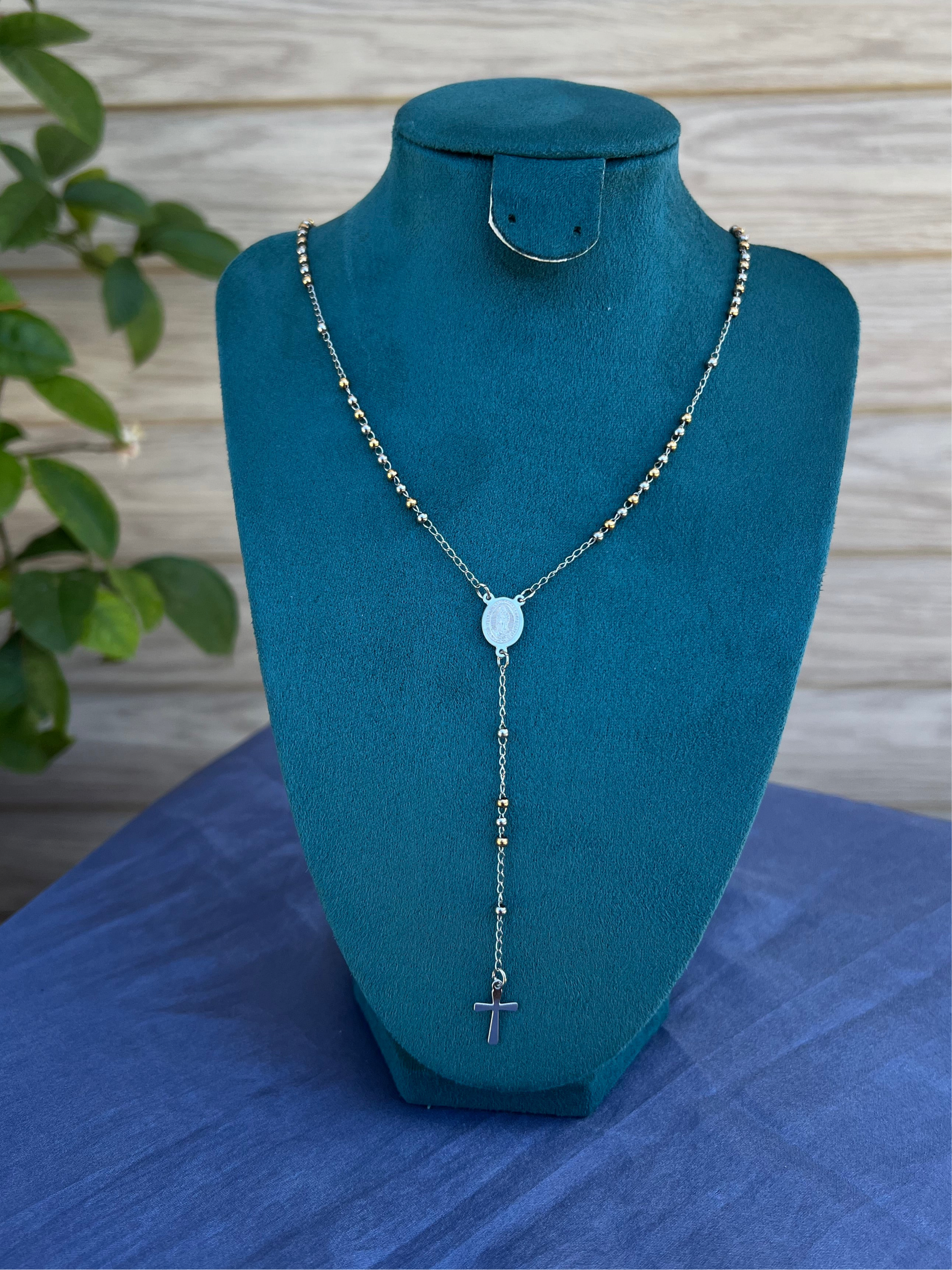 Acest rozariu este mai mult decât un accesoriu – este un simbol personal de credință, protecție și reflecție. Realizat cu grijă din elemente metalice în două tonuri (argintiu și auriu), cu un design discret și actual, rozariul poate fi purtat atât în scop spiritual, cât și ca piesă de bijuterie cu însemnătate profundă.
