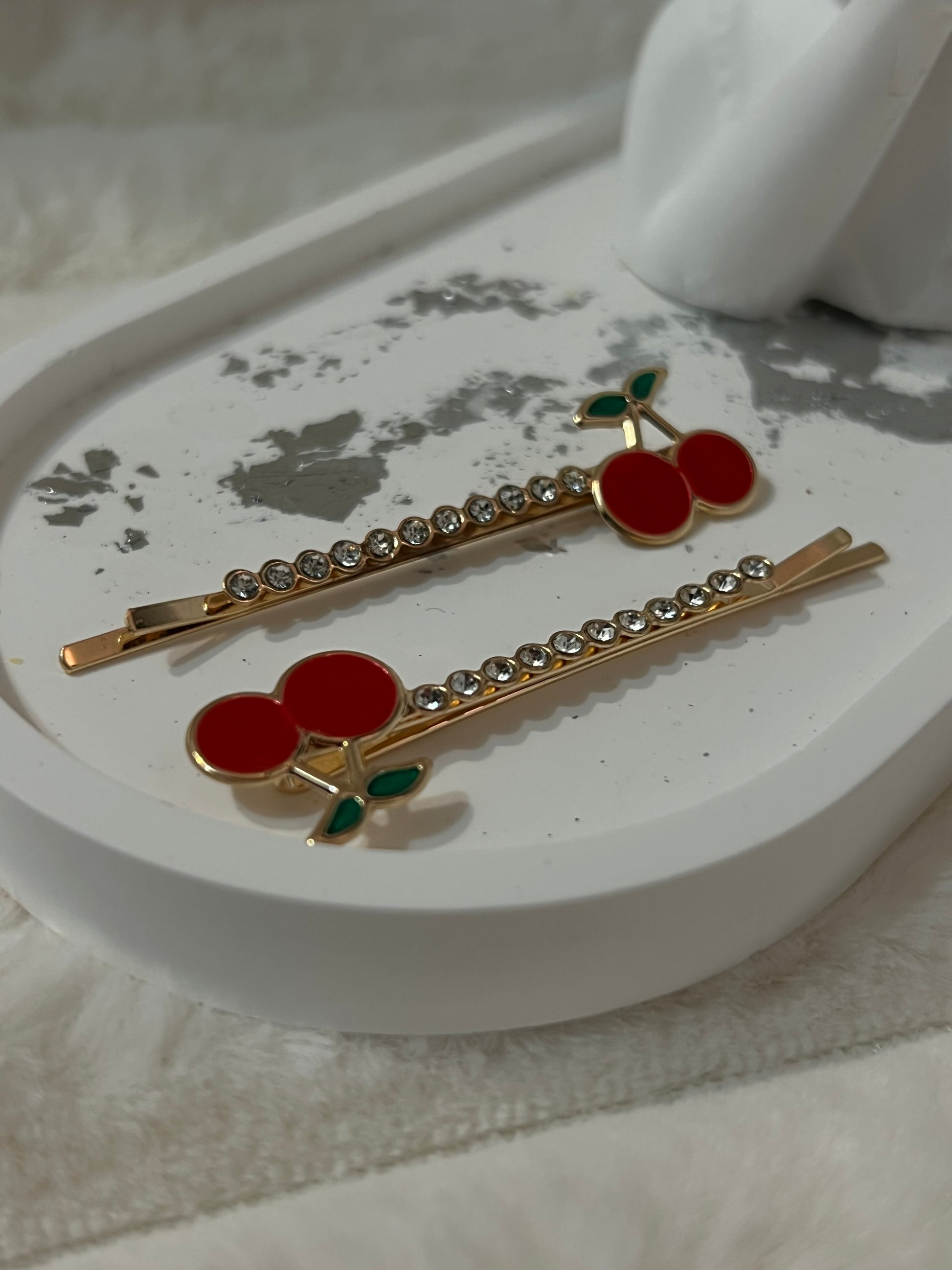 Un set adorabil de agrafe cu detalii în formă de cireșe, perfect pentru a adăuga o notă jucăușă și feminină coafurii tale. Ideale pentru look-uri casual sau pentru un plus de personalitate în ținutele de zi.